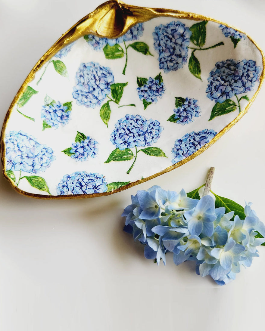 The beauty of nature has been repurposed into a one-of-a-kind work of art. Each decoupage seashell is handcrafted in Connecticut and painted with gold leaf finish on the back. Perfect as a decorative piece, ring dish, or jewelry holder. This coastal creation will make a wonderful addition to your home, or a thoughtful gift. Each item is unique, so shapes and sizes will vary.