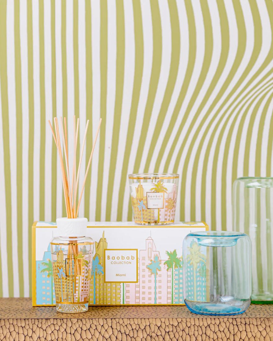 La candela profumata e il diffusore di fragranze Miami sono decorati con una serigrafia color pastello e oro ispirata all'architettura degli edifici art déco di South Beach.